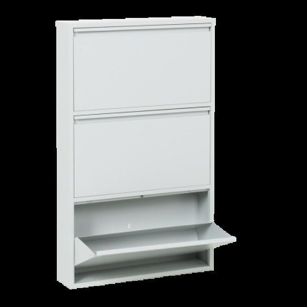 Металният шкаф за обувки Carmen CR-1228 E J съчетава стил, здравина и практичност. Изработен от праховобоядисан метал, моделът разполага с 3 отделения с падащи вратички, които побират между 9 и 12 чифта обувки. Идеален избор за коридори, офиси или обществени помещения. Пълна информация за размерите и характеристиките на модела ще намерите в таблицата в таб/поле 'Техническа информация'.