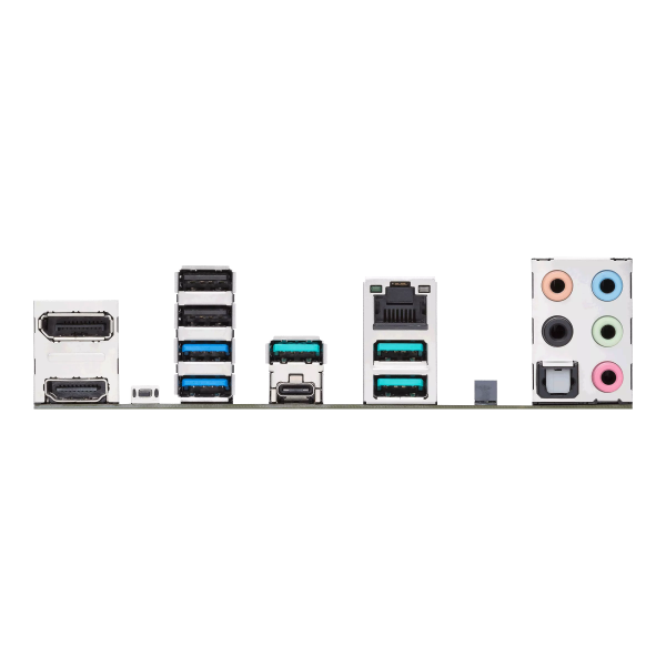 4 x USB 3.2 Gen 2 ports (3 x Type-A + 1 x USB Type-C®); 2 x USB 3.2 Gen 1 ports (2 x Type-A); 2 x USB 2.0 ports (2 x Type-A); 1 x DisplayPort; 1 x HDMI® port; 1 x Vertical M.2 slot (Key E); 1 x Realtek 2.5Gb Ethernet port; 5 x Audio jacks; 1 x Optical S/PDIF out port; 1 x BIOS FlashBack™ button