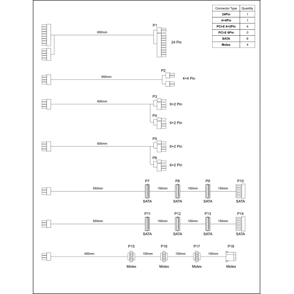 24Pin x 1 │ 4+4Pin CPU x 1 │ 6+2Pin VGA x 4 │ SATA x 8 │ Molex x 4