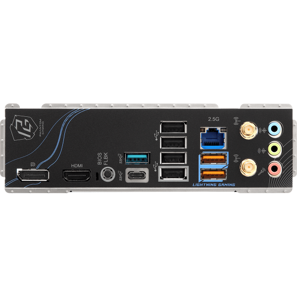 2 x Antenna Ports; 1 x HDMI Port; 1 x DisplayPort 1.4; 1 x USB 3.2 Gen2 Type-C Port (10 Gb/s); 1 x USB 3.2 Gen2 Type-A Port (10 Gb/s); 2 x USB 3.2 Gen1 Ports; 4 x USB 2.0 Ports; 1 x RJ-45 LAN Port; 1 x BIOS Flashback Button; HD Audio Jacks: Line in / Front Speaker / Microphone