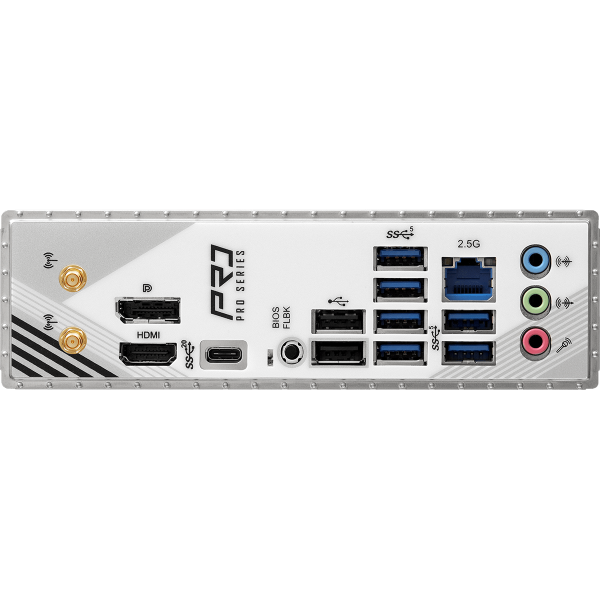 2 x Antenna Ports; 1 x HDMI Port; 1 x DisplayPort 1.4; 1 x USB 3.2 Gen2x2 Type-C Port (20 Gb/s); 6 x USB 3.2 Gen1 Ports; 2 x USB 2.0 Ports; 1 x RJ-45 LAN Port; 1 x BIOS Flashback Button; HD Audio Jacks: Line in / Front Speaker / Microphone