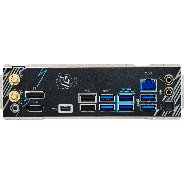 2 x Antenna Ports; 1 x HDMI Port; 1 x DisplayPort 1.4; 1 x Optical SPDIF Out Port; 1 x Thunderbolt™ 4 Type-C Port (40 Gb/s for USB4 protocol; 40Gb/s for Thunderbolt™ protocol); 2 x USB 3.2 Gen2 Type-A Ports (10 Gb/s); 4 x USB 3.2 Gen1 Ports; 2 x USB 2.0 Ports; 1 x RJ-45 LAN Port; 1 x BIOS Flashback Button; 1 x Line Out Jack (Gold Audio Jack); 1 x Microphone Input Jack (Gold Audio Jack)