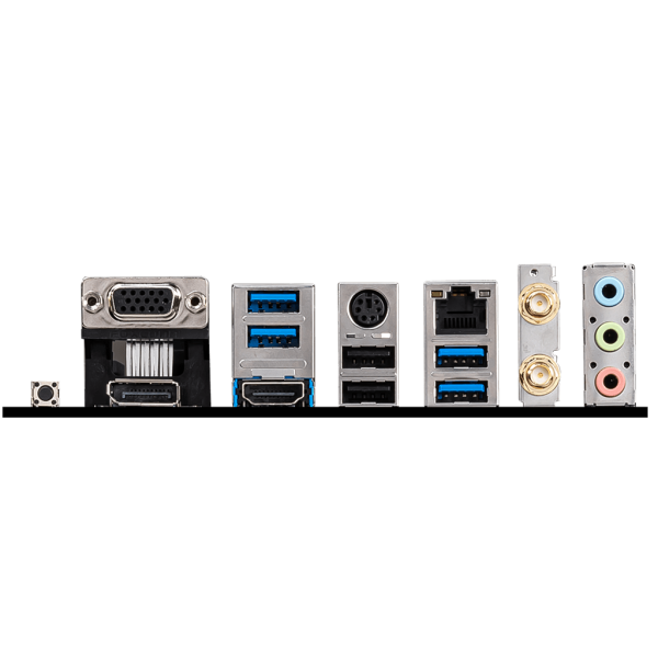 VGA; USB 3.2 Gen 1 5Gbps Type-A; Keyboard / Mouse; LAN; Flash BIOS Button; DisplayPort; HDMI; USB 2.0; USB 3.2 Gen 1 5Gbps Type-A; Wi-Fi Antenna connectors; 3x Audio jacks