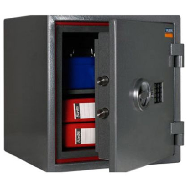 • Устойчивост на взлом клас I по БДС EN 1143-1 • Огнеупорност 60Б по ГОСТ Р 50862-96, 60 минути при 1000оC • Прахово полимерно покритие • Дебелина на вратата – 59 mm • Дебелина на стените – 25 mm • Двоен корпус със специална защита против рязане и разбиване • Тристранно заключване • Брави на Kaba Mauer, Германия • Възможност за монтаж към под • Гаранция – 2 години