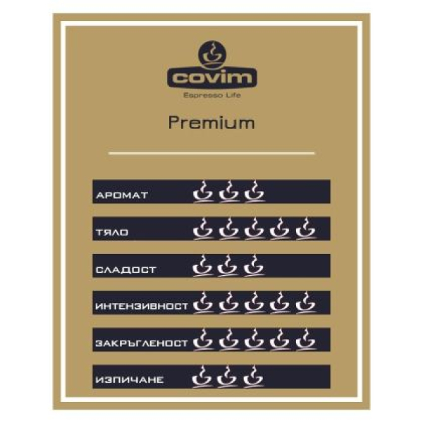• Covim Premium - кафе на зърна с наситен аромат, плътно тяло и балансиран вкус