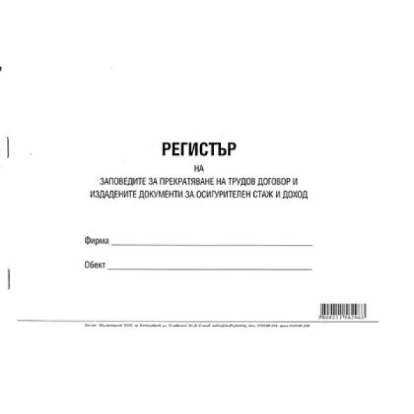 Регистър на заповедите за прекратяване на трудови договори Меки корици, вестник, А4 100 л.