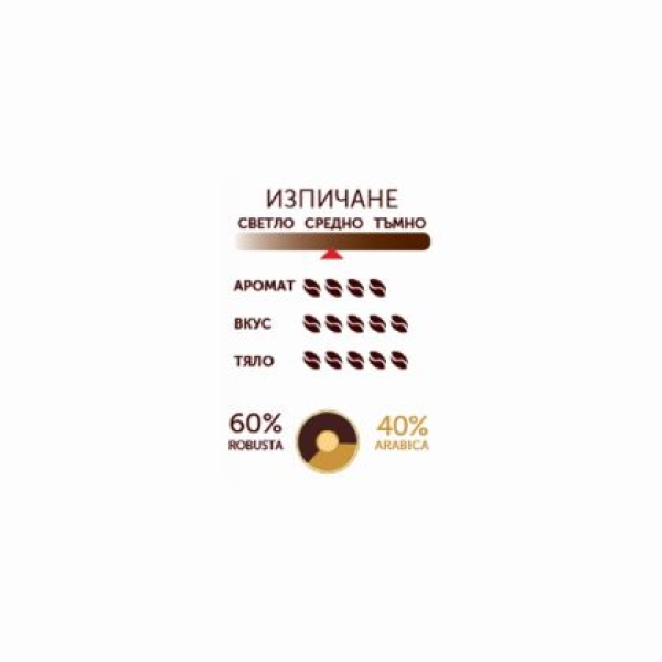 • Страхотен бленд от Арабика и Робуста с подчертана сладост и деликатни пикантни нотки. Плътно тяло, отличен богат вкус и аромат за съвършено еспресо. • Изпичане: Средно...