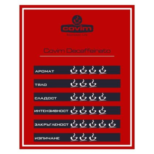 • Мляно кафе Covim Decaffeinato - деликатен вкус и гъста кремообразна пяна • Едно чудесно ароматно еспресо без кофеин • 50% Арабика, 50% Робуста • Продуктът е произведен и пакетиран в Италия